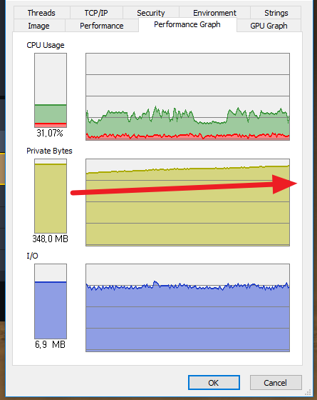* 실행 중인 exe의 속성 > 퍼포먼스 그래프
